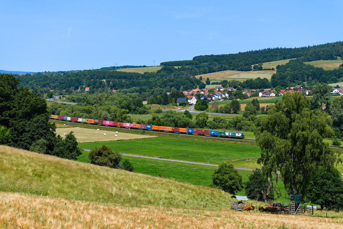 Schön bunt beladen zeigte sich der Containerzug DGS 42943 von Weddewarder Tief nach Enns in Oberösterreich am 21. Juni 2025. Dadurch hob sich der Zug, der für die Wiener Lokalbahnen Cargo verkehrte, bei Hermannspiegel in der Landschaft der Vorderrhön gut ab. Zuglok war die von ELL angemietete 193 238.