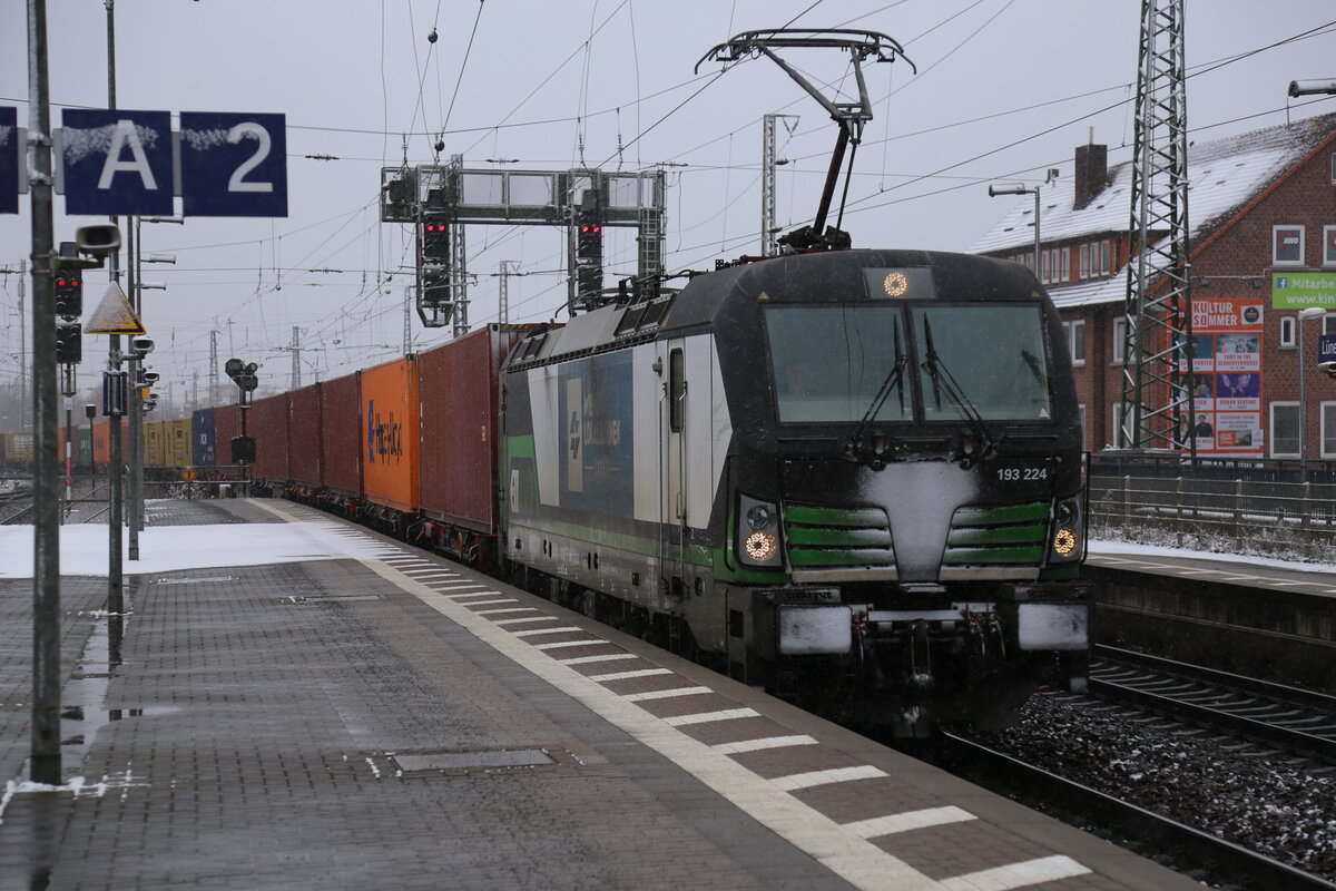 ELL 193224 fährt hier am 13.2.2026 mit einem Containerzug Richtung Hamburg um 11.57 Uhr durch den Bahnhof Lüneburg.