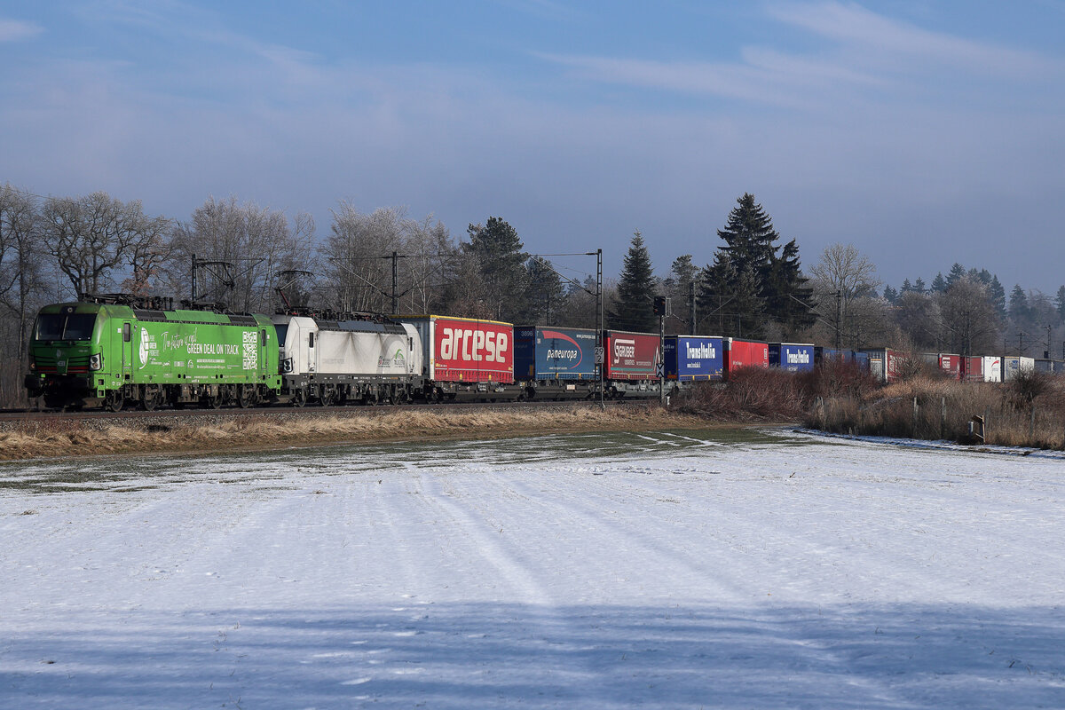 193 281 ELL/TXL  Green Deal on Track  und eine weiße Vectron Lok plus Auflieger am 23.01.2026 bei Zorneding.