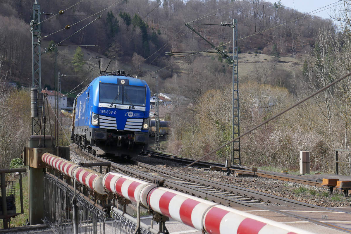 Vectron 193 838 der EGP fährt mit einem Zug aus geschlossenen Autotransportern aus Treuchtlingen kommend in den Bahnhof Solnhofen ein. Ziel des Zuges ist München - ein dortiger Automobilhersteller versendet seine Erzeugnisse in geschlossenen Waggons.