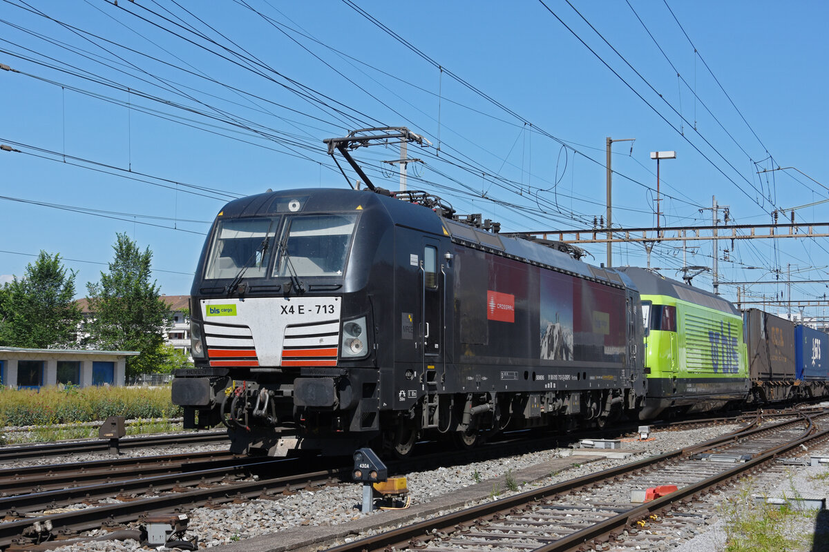 Doppeltraktion, mit den Loks 193 713-5 und 465 008-1 durchfährt den Bahnhof Pratteln. Die Aufnahme stammt vom 11.06.2022.