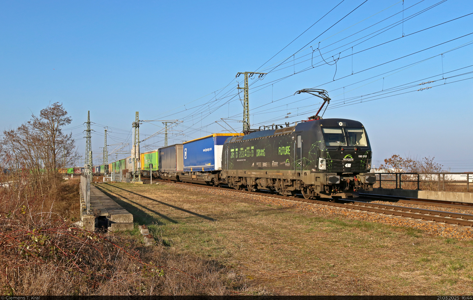 Hier fährt die Zukunft: 6193 212-8 "Driving into the future" (Siemens Vectron) wurde mit Sattelaufliegern auf der Brücke über die Leipziger Chaussee (B 6) in Halle (Saale) Richtung Abzweig Thüringer Bahn aufgenommen. 🧰 ELL Austria GmbH (European Locomotive Leasing), vermietet an die TX Logistik AG (TXL) 🕓 21.3.2025 | 16:44 Uhr