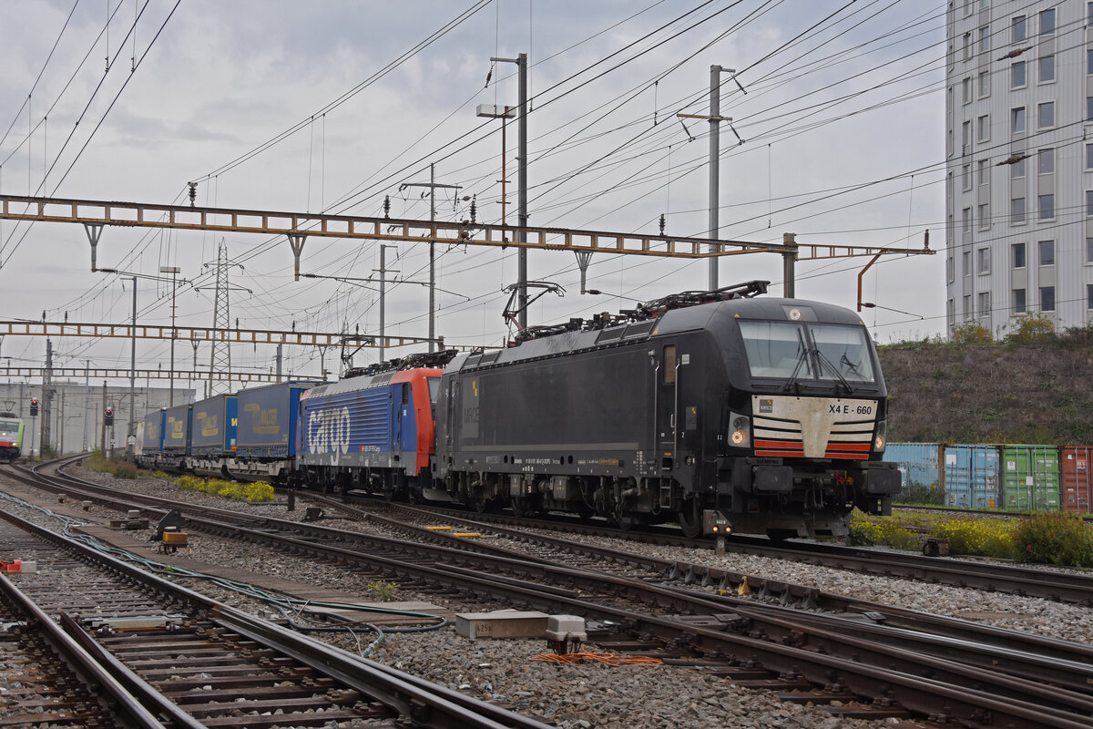 Doppeltraktion, mit den Loks 193 660-8 und 474 015-5 durchfährt am 13.10.2022 den Bahnhof Pratteln.