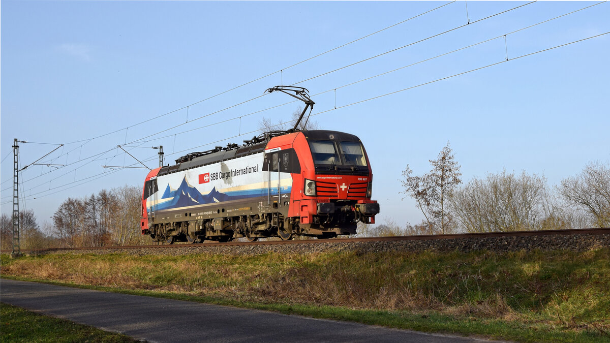 LokRoll 193 467 (91 80 6193 467-8 D-SIEAG), vermietet an SBB Cargo International, in Richtung Osnabrück (bei Lembruch, 06.03.2026).