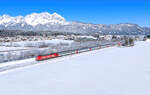 Die von Railpool gemietete 193 805 rollt am 25.12.2025 mit der S6 7360 von Wies-Eibiswald nach Graz Hbf kurz vor dem Bahnhof Deutschlandsberg beim Stiftungspark durch die weststeirische Winterlandschaft.