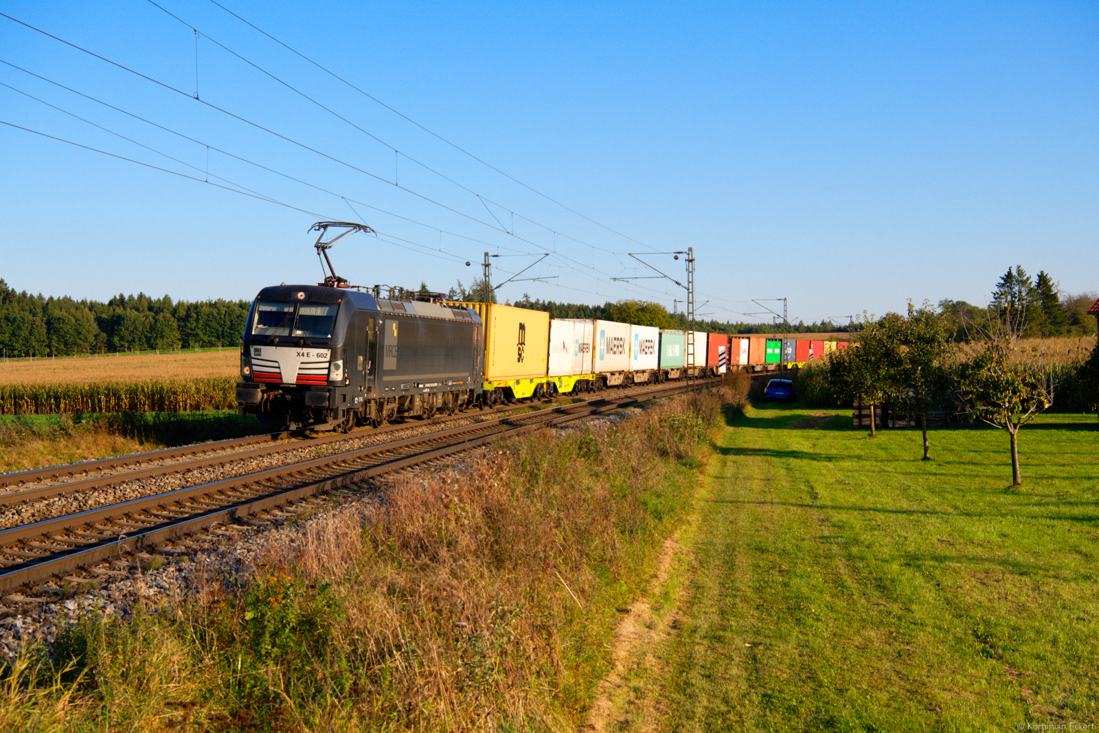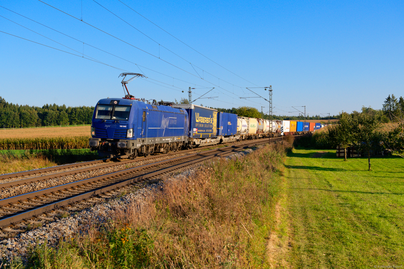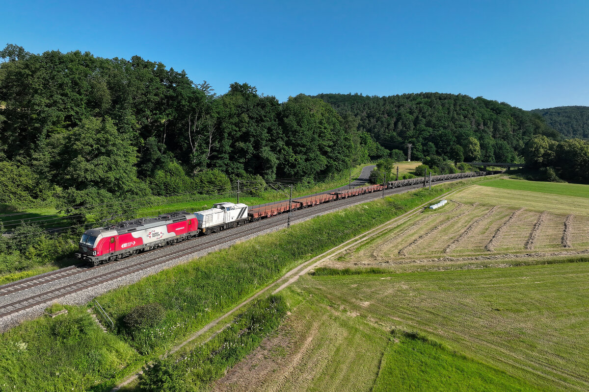 Eine ungewöhnliche Leistung verkehrte am Vormittag des 22. Juni 2025 auf der Nord-Süd-Strecke. Die 193 749 von Cargo Motion beförderte einen DGS 42390 von Děčín Vychod nach Hausach im Schwarzwald. Dabei handelte es sich um Langschienen für eine Gleisbaustelle. Die Bauzug-Lok 203 915 von RailTransport-Stift (RTTS) wurde auch mit überführt. Loks dieser tschechischen Unternehmen sind in Deutschland eher selten zu beobachten. Lichttechnisch verkehrte der interessante Zug eher ungünstig. Bei Odensachsen unternahm ich eine Dokumentation per Drohne.