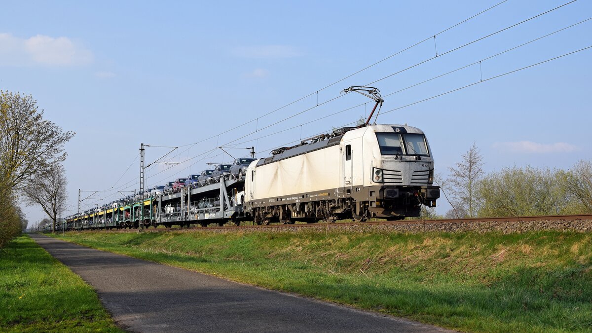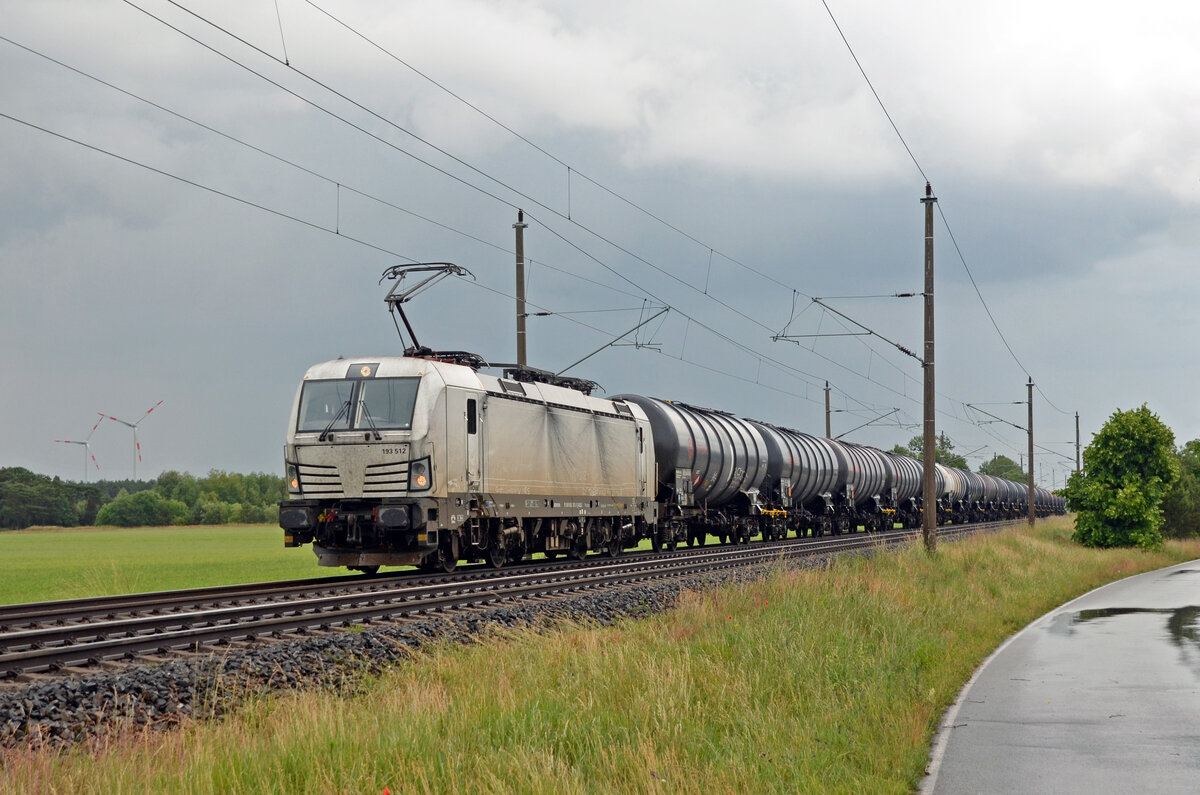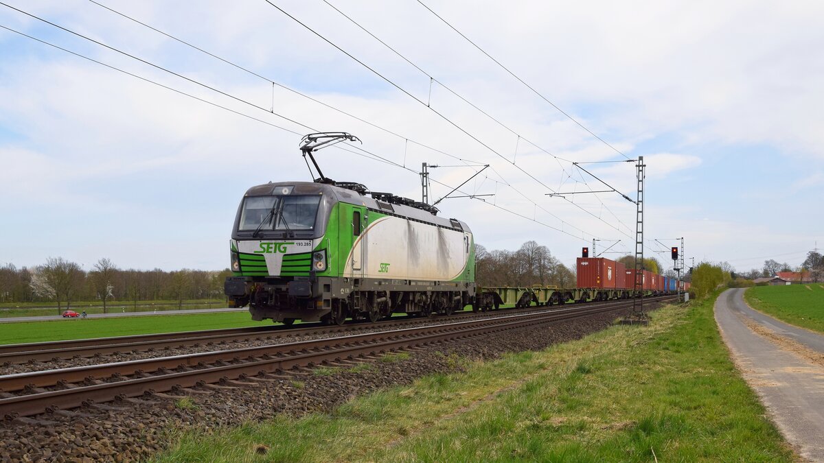 ELL 193 285 (91 80 6193 285-4 D-ELOC), vermietet an SETG, mit Containerzug in Richtung Osnabrück (Bohmte-Stirpe, 05.04.2025).