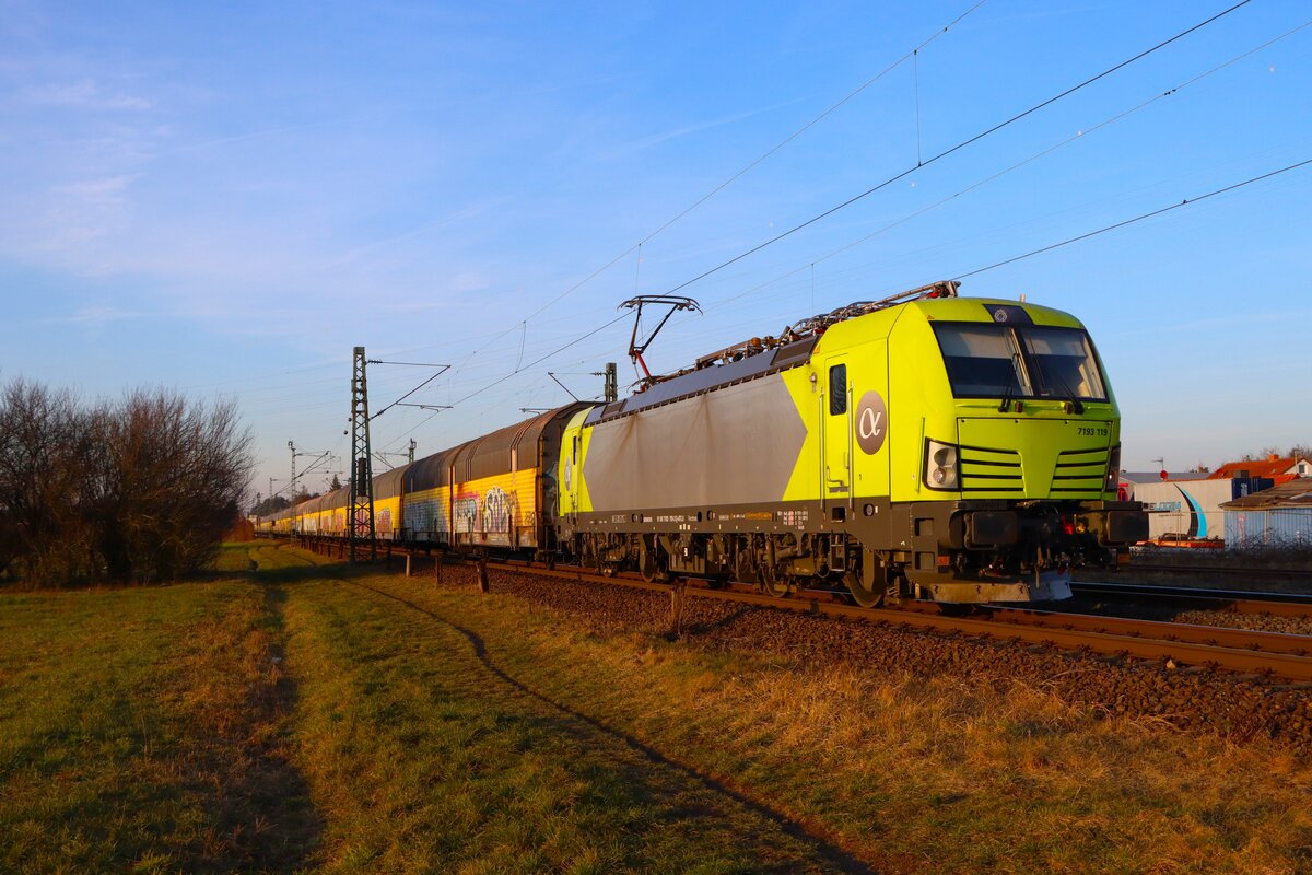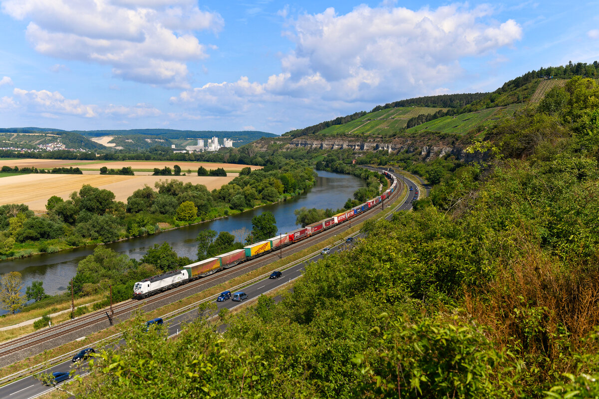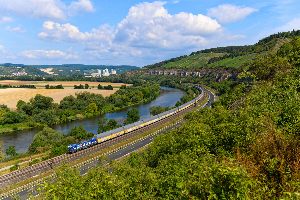Mit einem langen geschlossenen Autotransportzug fuhr am Vormittag des 18. Juli 2025 die für die Rurtalbahn Cargo im Einsatz stehende 193 791 durch das Maintal. Es handelte sich dabei um den DGS 44563 von Zeebrugge nach Landshut. Die seitlich Beschriftung des Vectrons hat die Buchstaben G und O eingebüßt. Möglicherweise war das sogar Absicht, denn so wird auf einen Teil des Aufgabenspektrums der Rurtalbahn Cargo hingewiesen - Leistungen im Bereich der Automobil-Logistik. Die Aufnahme entstand zwischen Karlstadt und Himmelstadt aus den Weinbergen heraus. Christoph Schneider
