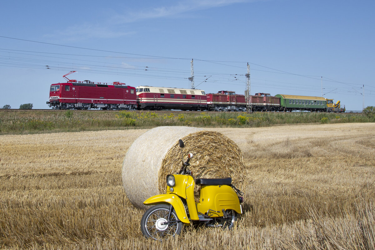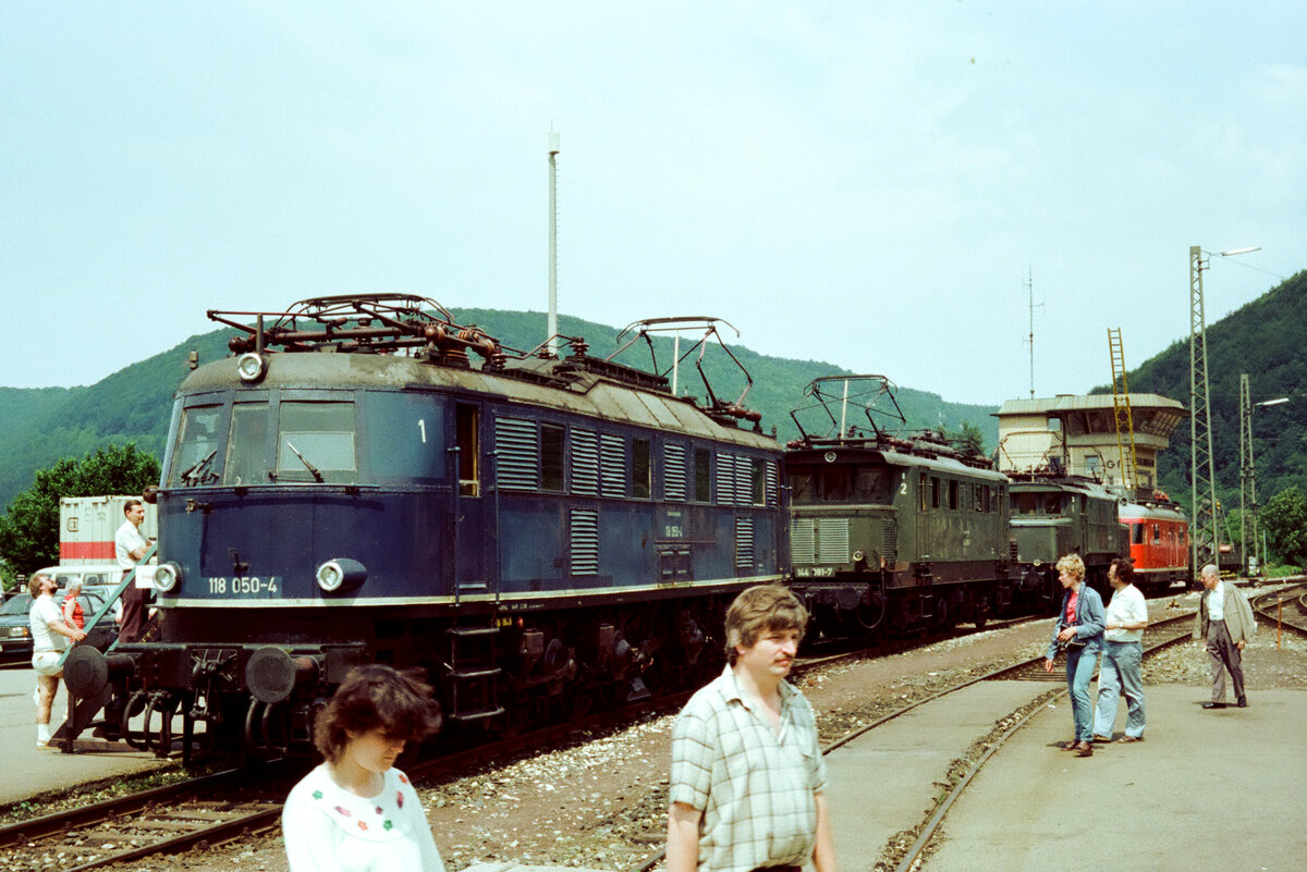 Die ehemalige Traditionslok der DR mit der früheren Tfz.-Nummer E 18 31 am 28.08.1990 auf einer Fahrzeugausstellung im Bw. Magdeburg Hbf. Auch wenn es vor Ort keine Oberleitung gab, hatten die Organisatoren der Ausstellung "ein Herz für die Fotografen" und präsentieren die Elektroloks aufgebügelt-