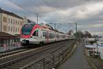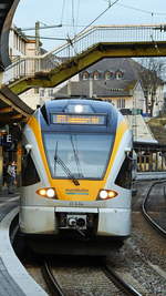 Der Elektrotriebzug ET6.04 im Februar 2021 bei der Abfahrt vom Hauptbahnhof Wuppertal.
