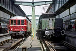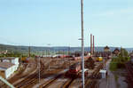 Veranstaltung im Ausbesserungswerk Cannstatt (16.03.1984): Vorn ein Museumszug der DB-Baureihe ET 85 und daneben etwas weiter entfernt ein Zug der DB-Baureihe 425 alt (der Zug wurde noch fahrplanmäßig eingesetzt).