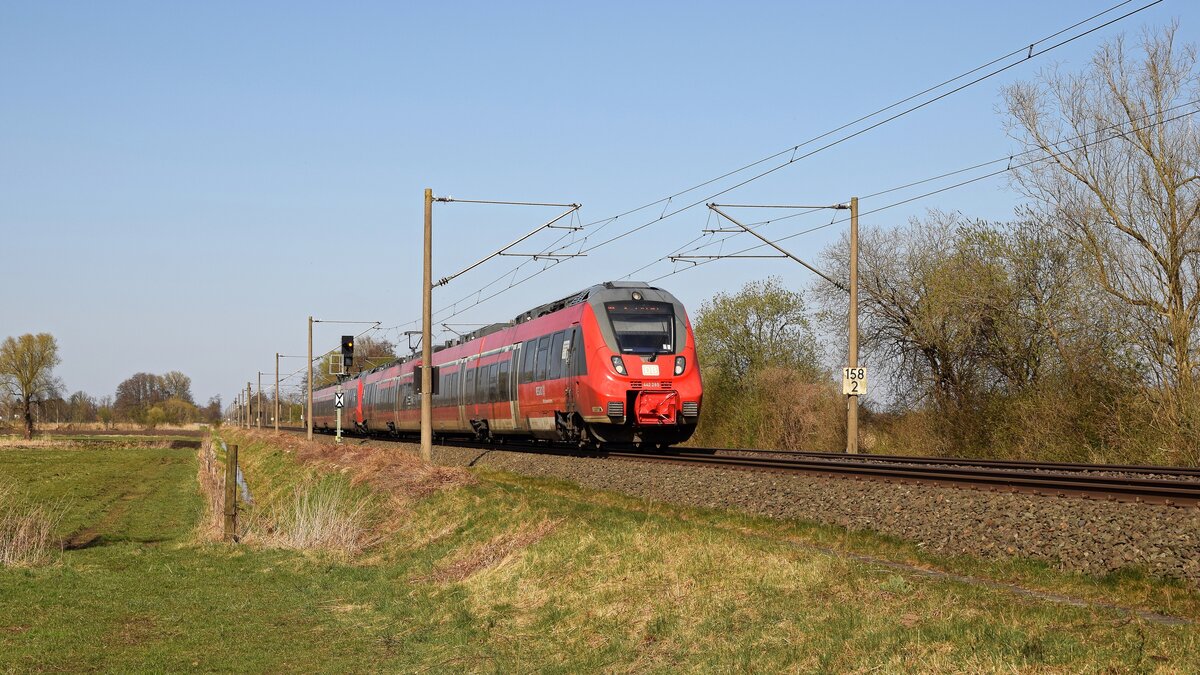 DB Regio 442 285/785 und 442 287/787, angeführt von 442 285, als RE 9 nach Osnabrück Hbf (Hüde, 02.04.2025).