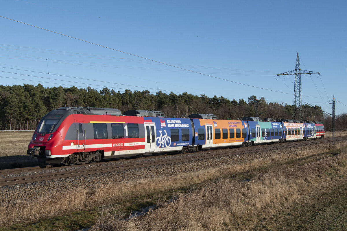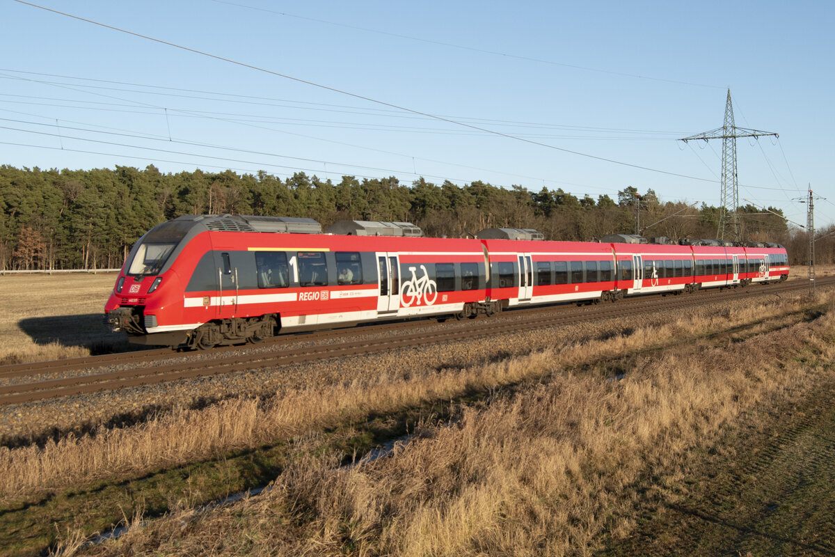 Am 28.12.2025, bei Ahresndorf, fuhr 442 821 als RB22 (Königs Wusterhausen - Potsdam), in Richtung Saarmund, auf dem Berliner Außenring. Auffallend als einzig beklebter Hamsterbacke in der Region.