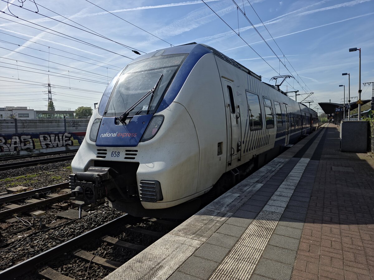 Zum ersten Mal seit langer Zeit ist der RE 44 Fossa-Emscher-Express wieder unterwegs, bis Juli mit einem Talent 2 von National Express. Dieses Foto wurde am 18.04.2026 am Bottrop Hbf aufgenommen.