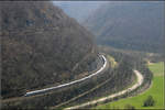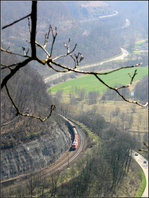 Unbekannter 5-teiliger Flirt 3 rollt am 08.07.2022 als MEX 16 Ulm-Stuttgart die Geislinger Steige hinunter. Die Aufnahme entstand vom sogenannten Geiselstein.