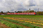 Der April macht was er will. Sehr wechselhaft zeigte sich das Wetter im Frühjahr 2023. Schönwetterperioden fanden praktisch nicht statt. So war ich am 26. April 2023 über ein paar Sonnenstrahlen froh, die bei Baierbrunn ein Bild eines ein Tulpenfeld passierenden Vollzuges der S7 ermöglichten. So konnte ich zumindest etwas frühlingshafte Vegetation im Bahnkontext dokumentieren.