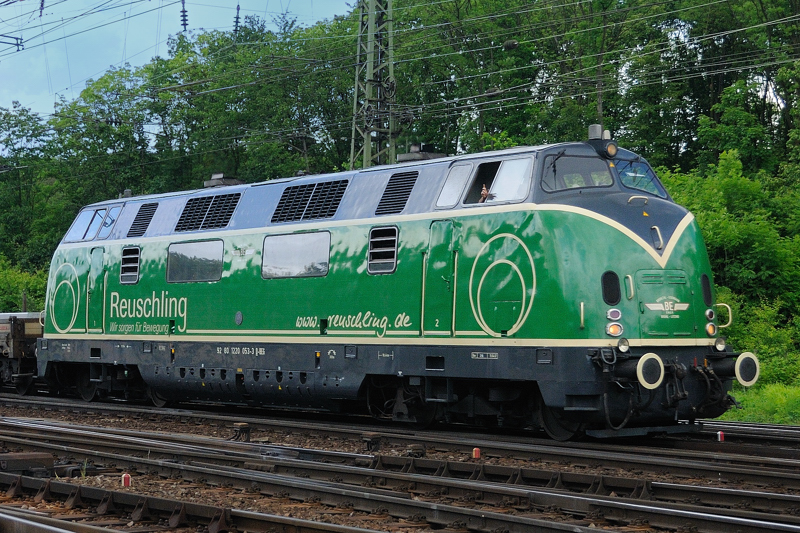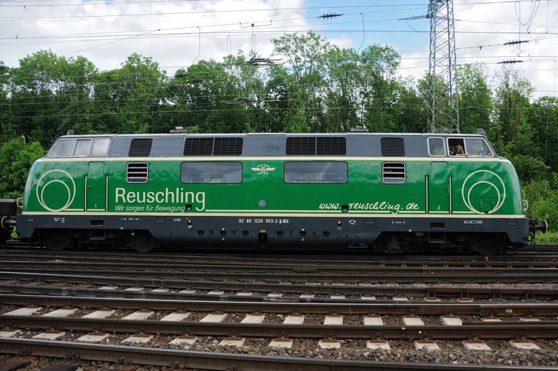 Diese Lok verdient eine kleine, eigene Mini-Serie. "V 200" 220 053-3 von "Reuschling" in ihrer extravaganten grünen Lackierung vor einem kurzen, aber schweren Stahlblock-Zug in Köln-Gremberg am 19. Mai 2009. Helmut Dimitroff