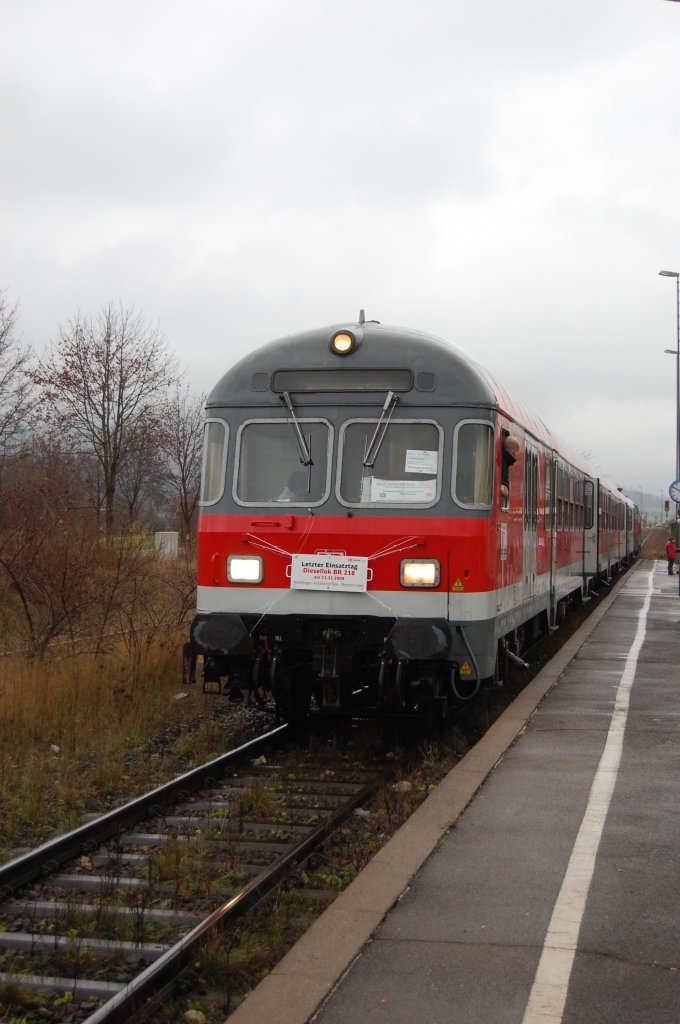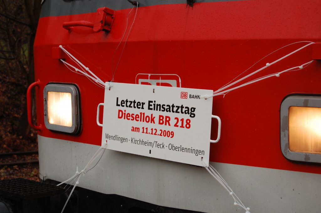 Nicht nur die 218-Fans trauern wegen des Abschieds der BR 218 von der Teckbahn, nein, auch das Personal scheint traurig darüber zu sein, und versah den Kühlergrill der Lok deshalb mit diesem Schild und 2 schwarzen Trauerbändern... (11.12.2009)