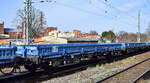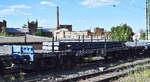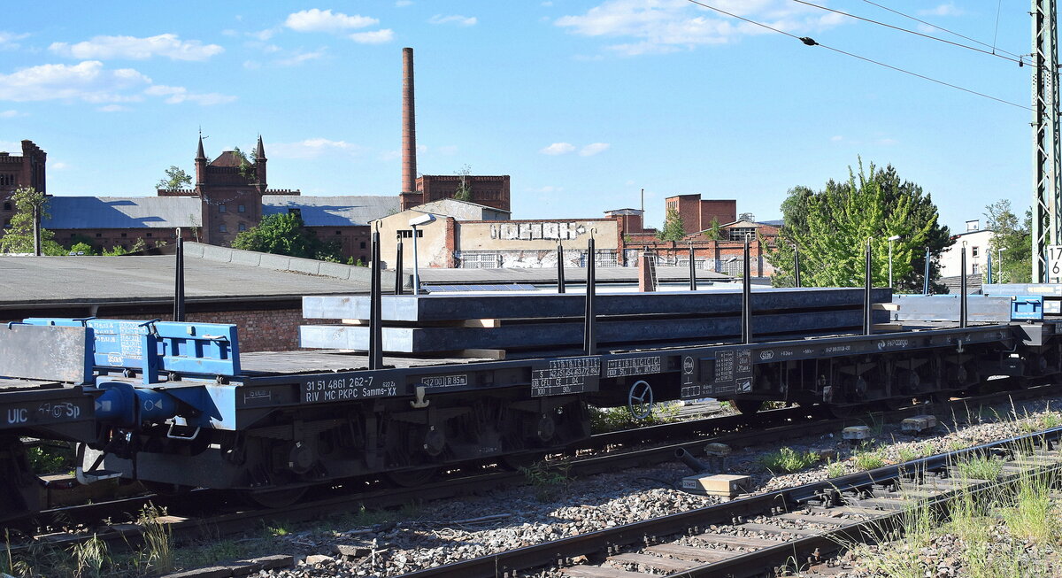 Sechsachsiger Drehgestell-Flachwagen vom Einsteller PKP Cargo mit Stahlbrammen beladen mit der Nr. 31 RIV MC 51 PL-PKPC 4861 262-7 Samms-XX in einem Ganzug am 14.05.24 Höhe Bahnhof Magdeburg-Neustadt.