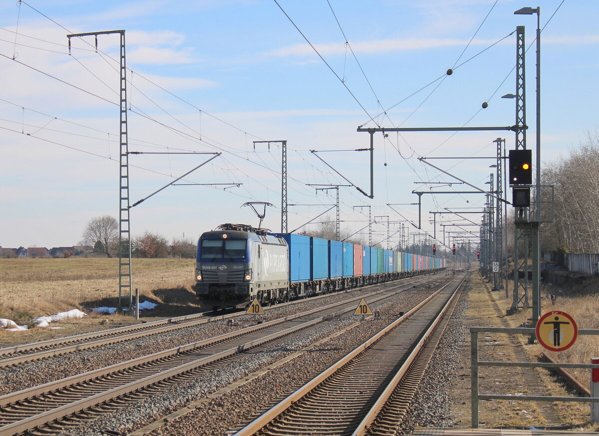 ELL 193224 fährt hier am 13.2.2026 mit einem Containerzug Richtung Hamburg um 11.57 Uhr durch den Bahnhof Lüneburg.
