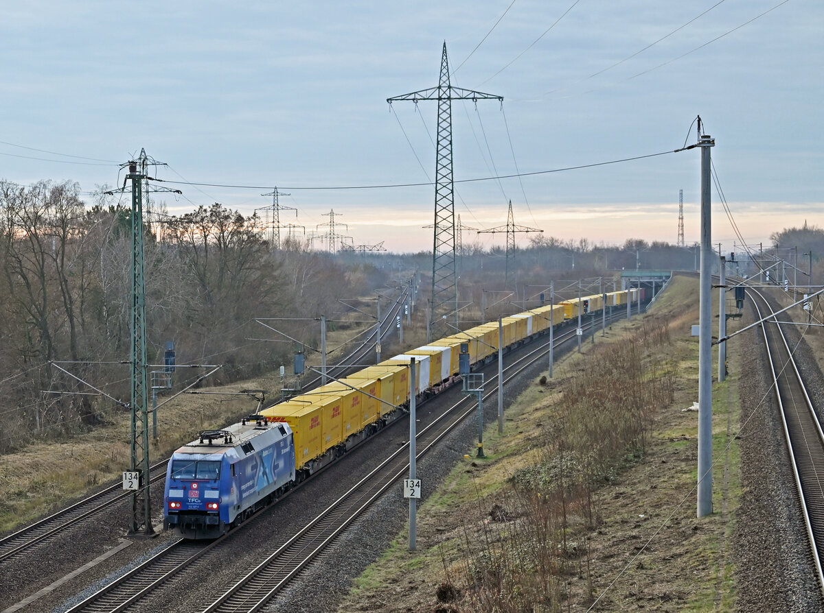 Am 03.12.25 führte der Albatros 152 137 einen DHL-Containerzug durch Holzweißig Richtung Bitterfeld/Berlin.