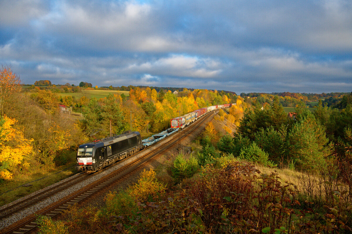 193 877 MRCE/WLC mit einem Containerzug bei Laaber Richtung Nürnberg, 25.10.2020