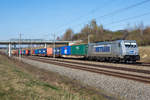 METRANS Rail s.r.o., Praha (CZ) mit 386 028-5 (NVR-Nummer: 91 54 7386 028-5 CZ-MT) sowie einem Containerzug am 06. März 2026 bei der Durchfahrt durrch den Bahnhof Dabendorf.