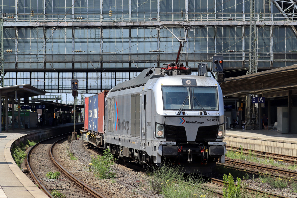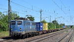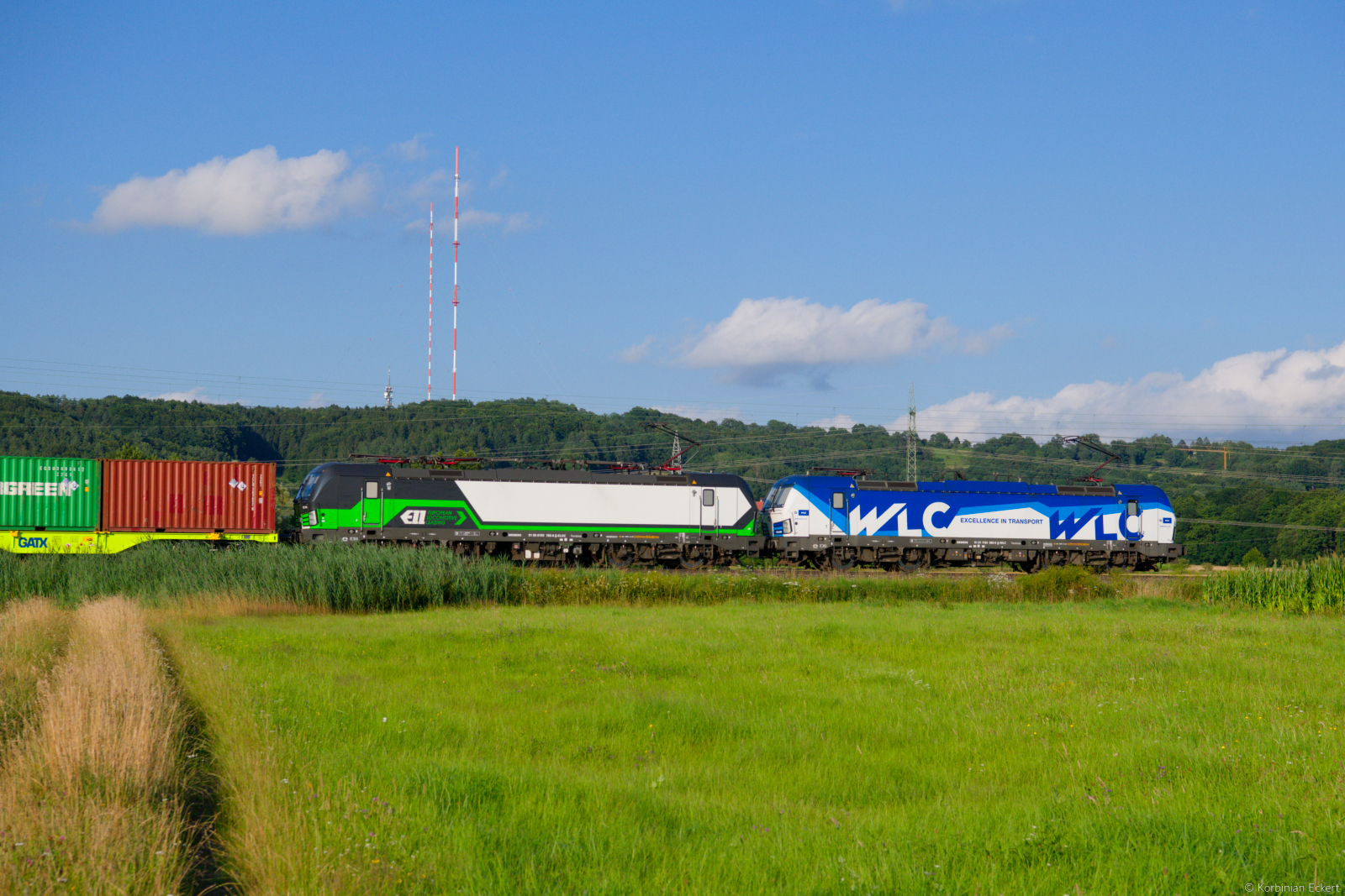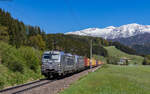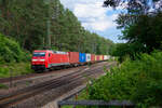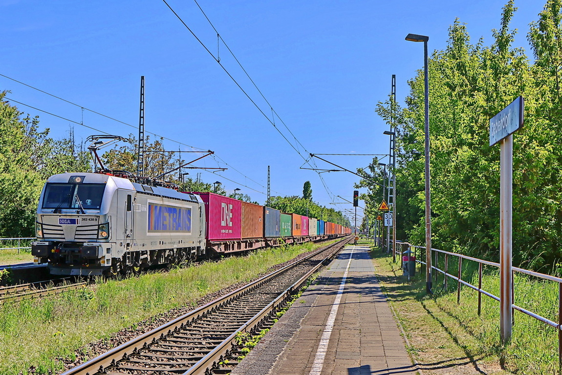 METRANS a.s., Praha [CZ] mit 383 438-9 (NVR-Nummer: 91 54 7383 438-9 CZ-MT) mit einem Containerzug durchfährt am 12. Mai 2024 den Bahnhof Dabendorf in Richtung Berlin.