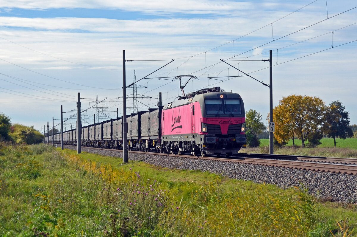 Der Laude-Vectron 370 034 schleppte am 19.10.25 einen Ganzzug Laude-Planencontainer durch Braschwitz Richtung Magdeburg.