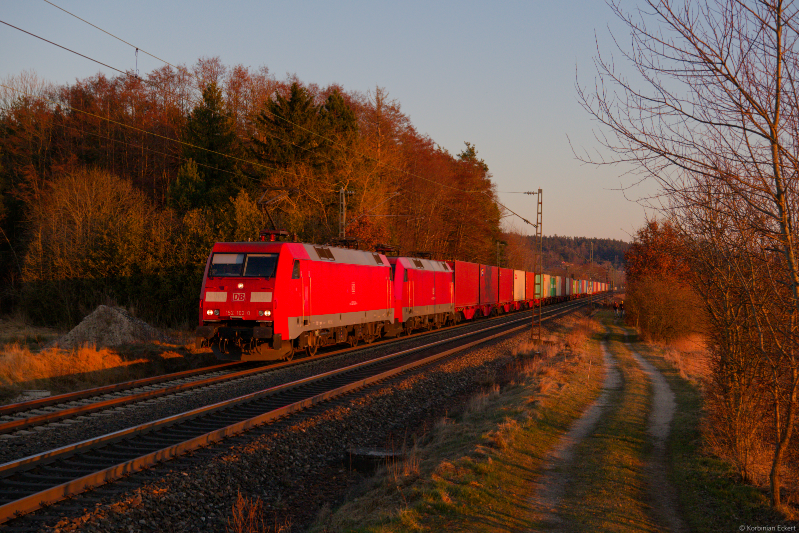 Containerzug mit 383 011-4 "Quer durch Europa" (Siemens Vectron) legt sich bei Ovelgünne Richtung Helmstedt in den Gleisbogen.