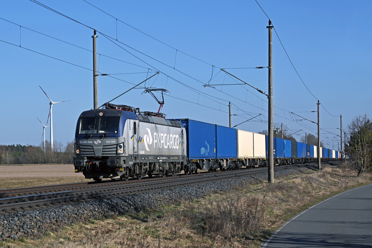 370 016 der PKP Cargo führte am 06.03.26 einen blau-weißen Containerzug durch Wittenberg-Labetz Richtung Dessau.