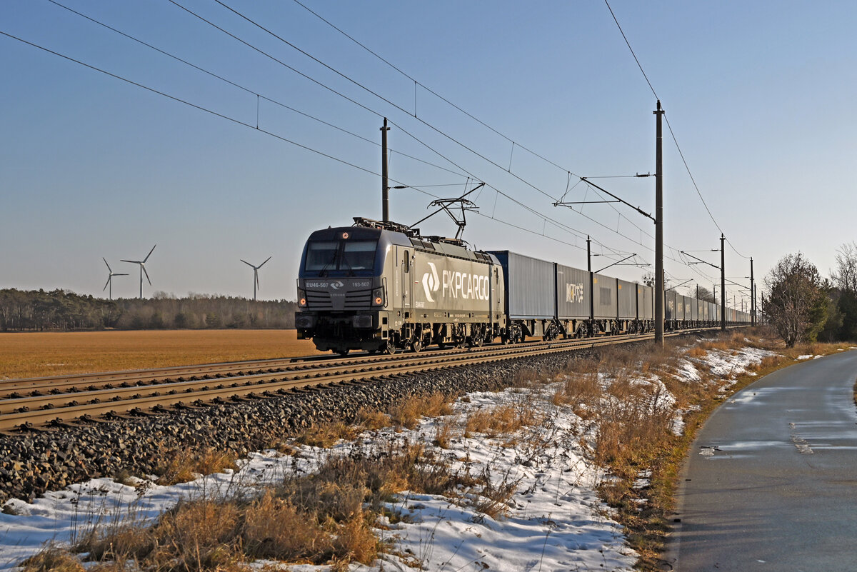 370 019 der PKP Cargo führte am 18.01.26 einen China-Containerzug durch Wittenberg-Labetz Richtung Dessau.