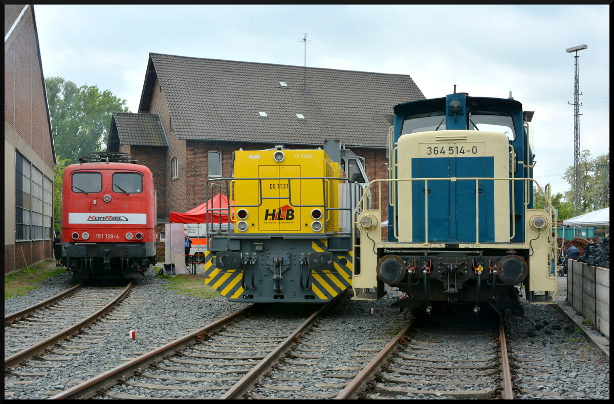 Die Elektrolok ex DB 151 129-4 jetzt KonRail, sowie die Dieselloks DB 364 514-0 und HLB DG 1131 (MaK G 1206, NVR: 92 80 1275 024-8 D-HEB) beim Lokschuppenfest der Museumseisenbahn Hanau am 18. Mai 2025.