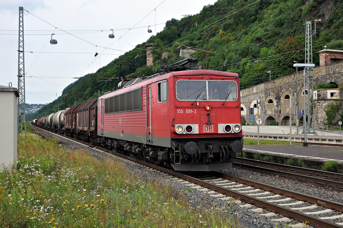 DB Schenker Rail 155 091 mit gemischtem Güterzug auf der rechten Rheinstrecke in Richtung Rüdesheim (Koblenz-Ehrenbreitstein, 14.08.2012).