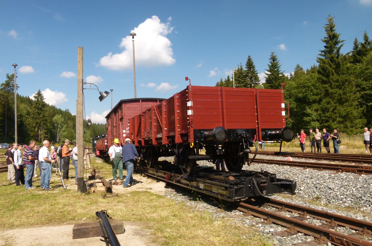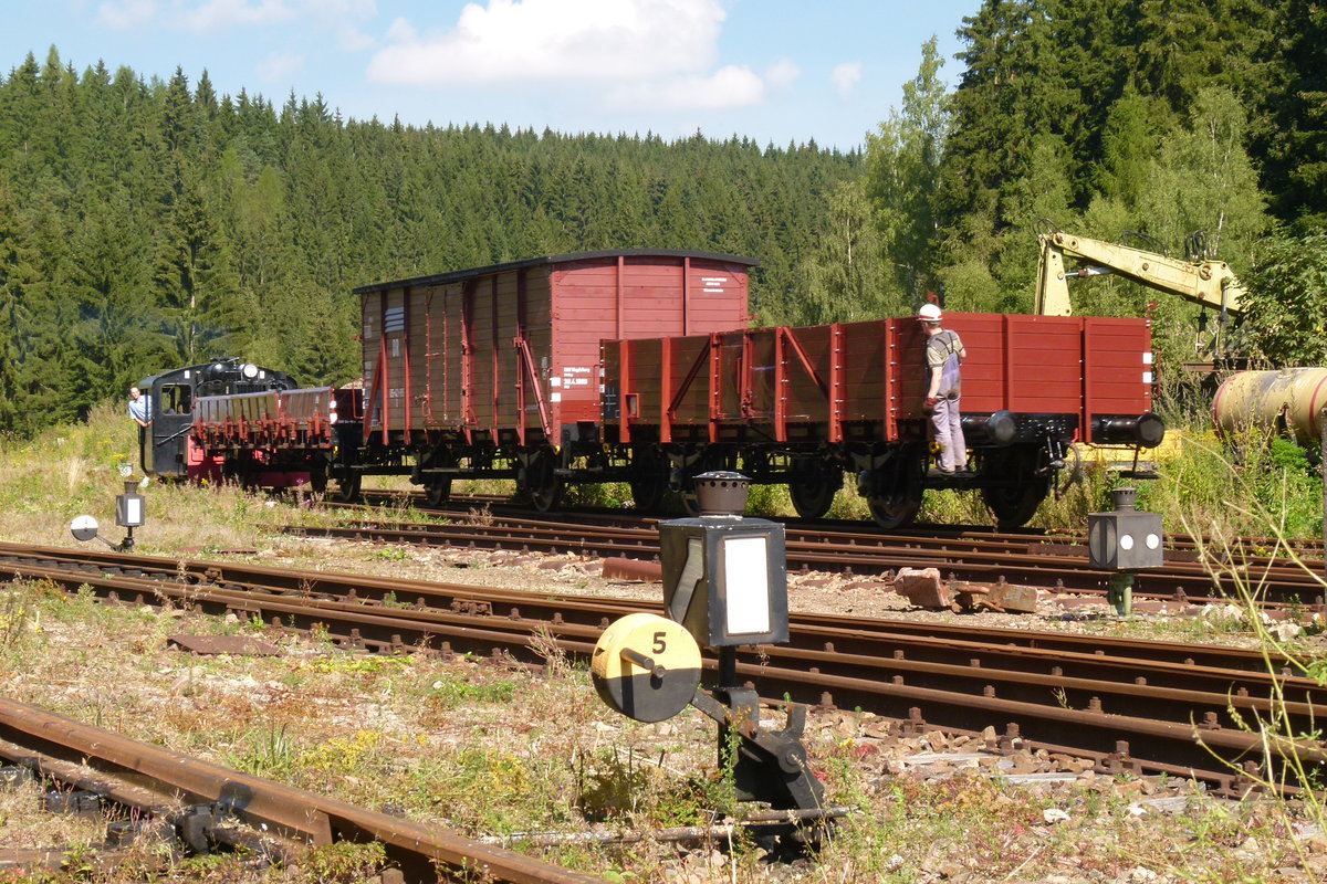 03.09.2011, V.WCd-Schmalspurbahnfestival im Bahnhof Schönheide Süd. Schön war's und sogar das Wetter spielte erstmals mit. Hauptprogrammpunkt war das Verladen von regelspurigen Güterwagen auf Schmalspur-Rollwagen. Lok 99 574 rangierte den Schmalspur-Güterzug, 99 606 war als Deko aufgestellt und Kö 4017 brachte die Regelspurwagen heran.