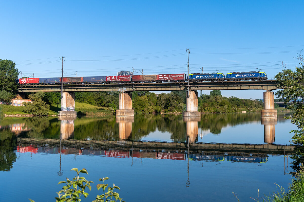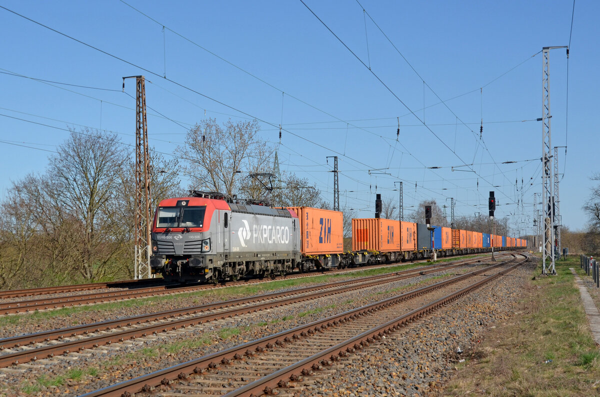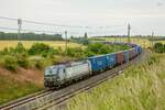 PKP CARGO S.A., Warszawa [PL] mit ihrer "EU46-518" [NVR-Nummer: 91 51 5370 031-4 PL-PKPC] und einem Ganzzug Containertragwagen (leer) am 03.05.24 Durchfahrt Bahnhof Berlin-Hohenschönhausen.
