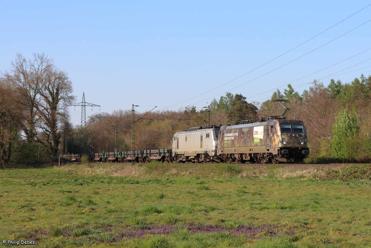 188 063-2 "#ECOLOGISTICS" (CFL Cargo) zieht 37012 (Akiem) und einen Güterzug durch Ratingen Lintorf, 4. April 2025