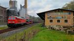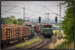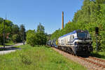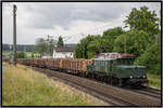 Netzwerkbahn Sachsen (NeS) mit 159 248 im Holzverkehr auf der Flöhatalbahn verlässt den Kreuzungsbahnhof Grünhainichen-Borstendorf in Richtung Chemnitz am 8. August 2023.
