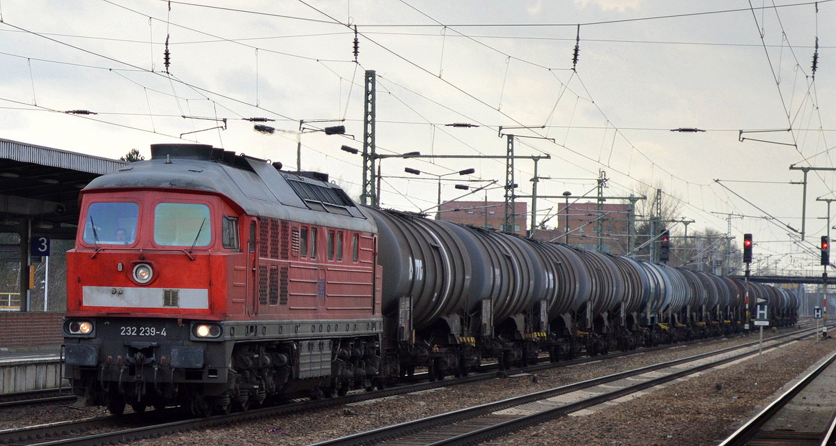 Erfurter Bahnservice GmbH mit ihrer 232 239-4 und Kesselwagenzug (leer) Richtung Stendell am 09.03.18 Bf. Flughafen Berlin-Schönefeld.