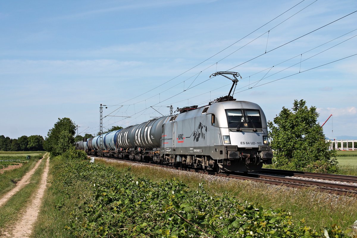 Mit einem vollen Kesselzug in die Schweiz fuhr am späten Nachmittag des 26.05.2020 die HUPAC/WRS ES 64 U2-102 (182 602-3) südlich von Buggingen über die Rheintalbahn durchs Markgräflerland in Richtung Müllheim (Baden).