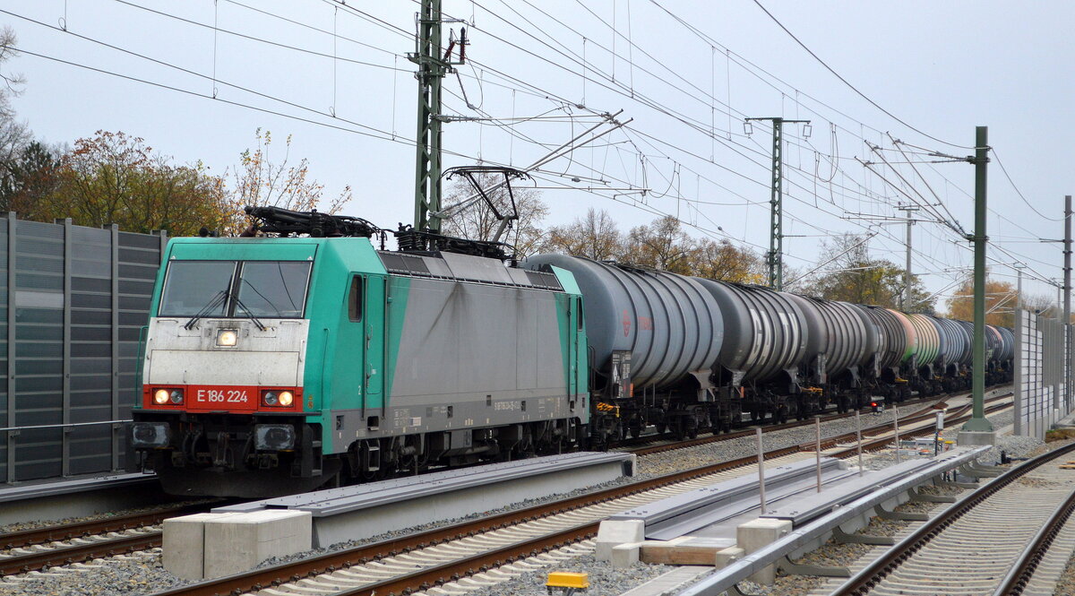 Crossrail Benelux N.V., Borgerhout [B] mit "E186 224" [NVR-Nummer: 91 88 7186 224-2 B-ATLU] und Kesselwagenzug (leer) Richtung Stendell am 01.11.21 Berlin Karow.