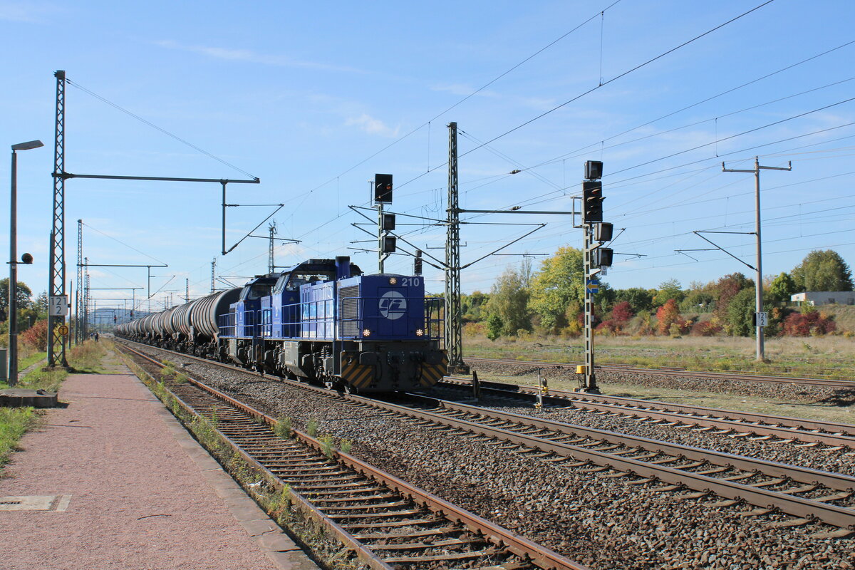 InfraLeuna 210 (92 80 1275 013-1 D-LEUNA) + 211 (92 80 1275 014-9 D-LEUNA) mit Kesselwagen Richtung Erfurt, am 06.10.2022 in Neudietendorf.