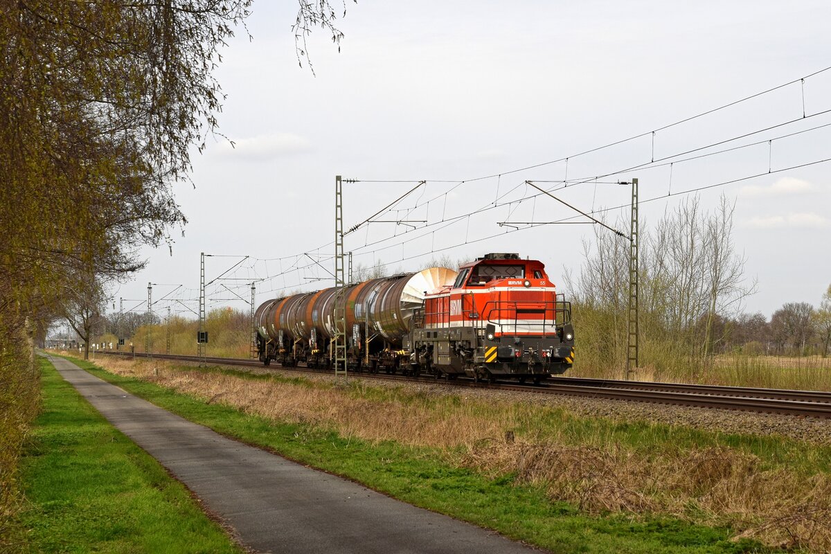 RVM 55 (4185 025) mit Kesselwagenzug in Richtung Osnabrück (Lembruch, 27.03.2024).