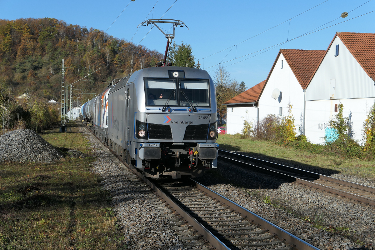 Ein gepflegter Smartron der Rheincargo, 192 055, durchfährt mit einem Kesselwagenzug den Haltepunkt Dollnstein auf dem Weg nach Ingolstadt. Hinter dem Smartron ist ein Vectron Dualmode eingereiht. Danke an den freundlichen Lokführer!