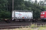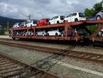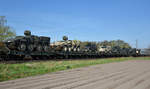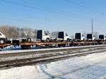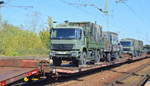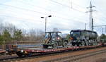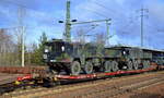 Flachwageneinheit mit abgesenktem Fußboden vom Einsteller TRANSWAGGON im Einsatz für die Bundeswehr mit der Nr. 23 RIV 80 D-TWA 4334 288-6 (P) Laadks 800 A beladen mit zwei Bundeswehr LKW 10 t mil gl KAT I (8×8) am 10.01.19 in einem Militärtranportzug Bf. Flughafen Berlin-Schönefeld.
