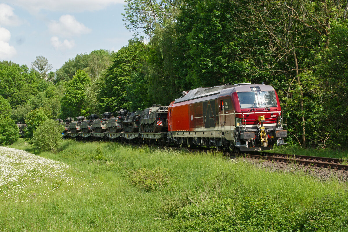 Hier zusehen ist 249 001 mit Altrot vorraus am 23.5.24 mit dem ersten, mit Baureihe 249 bespannten Militärzug, welcher in Pockau-Lengefeld verladen wurde, zwischen Falkenau und Flöha auf dem Weg nach Chemnitz und ab da mit einer anderen E-Lok weiter Richtung Riesa.