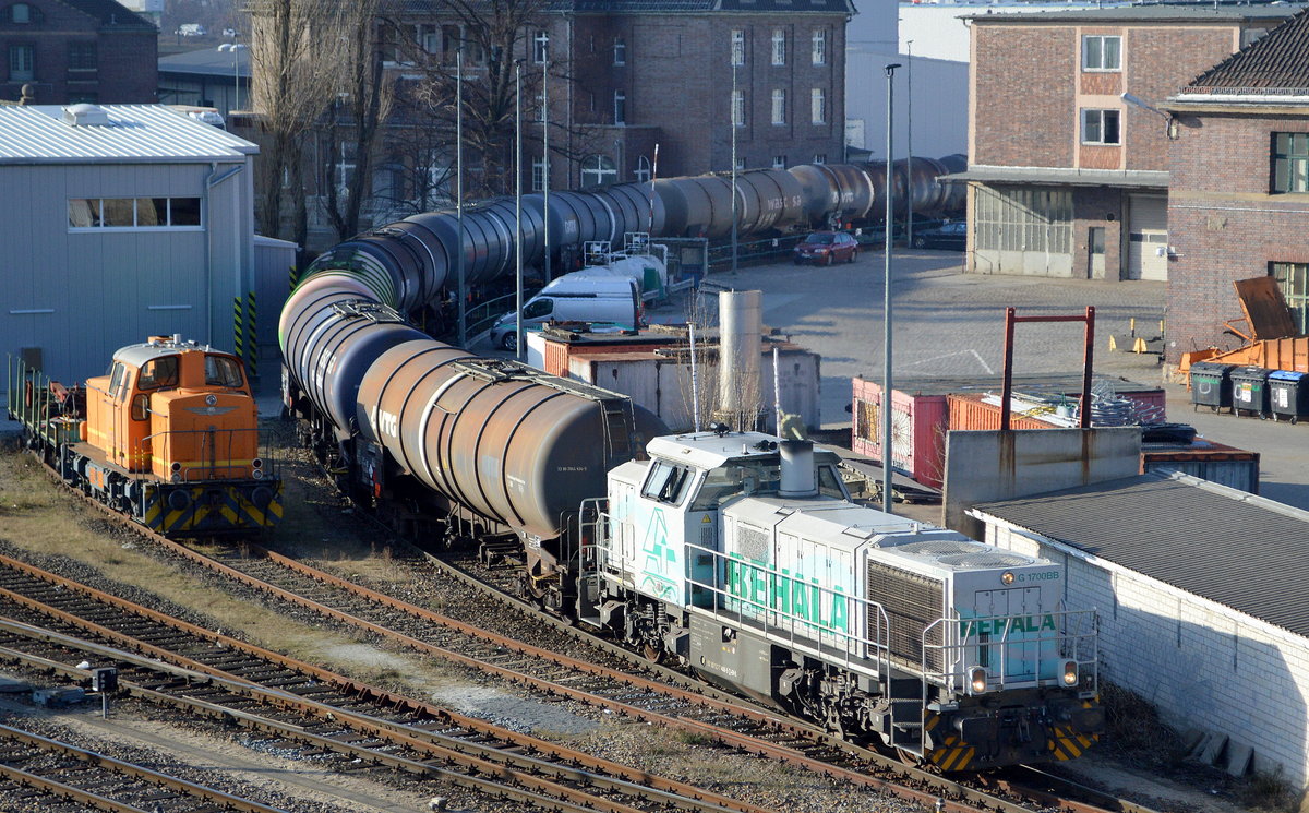 Die BEHALA Lok 277 406-5 (92 80 1277 406-5 D-BHL) schiebt einige Tankkesselwagen (Dieselkraftstoff) zum Tanklager des Berlin Westhafens, 25.02.19 Lothar Stöckmann