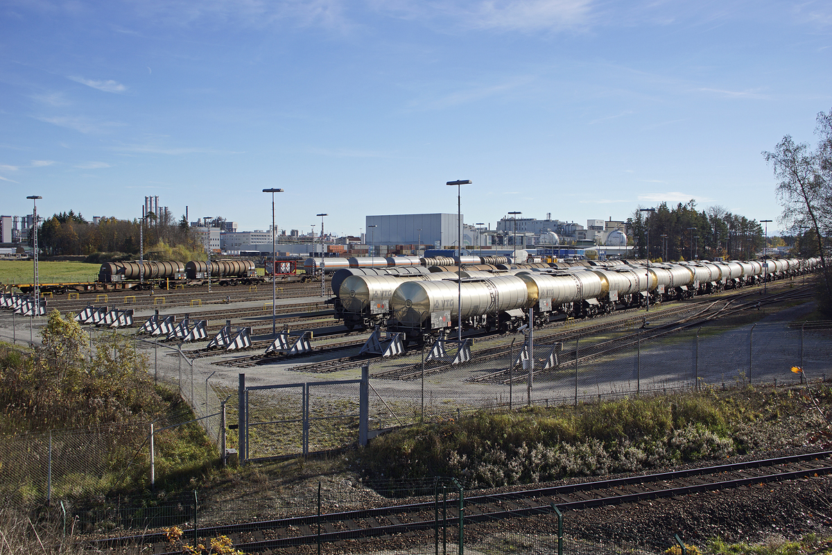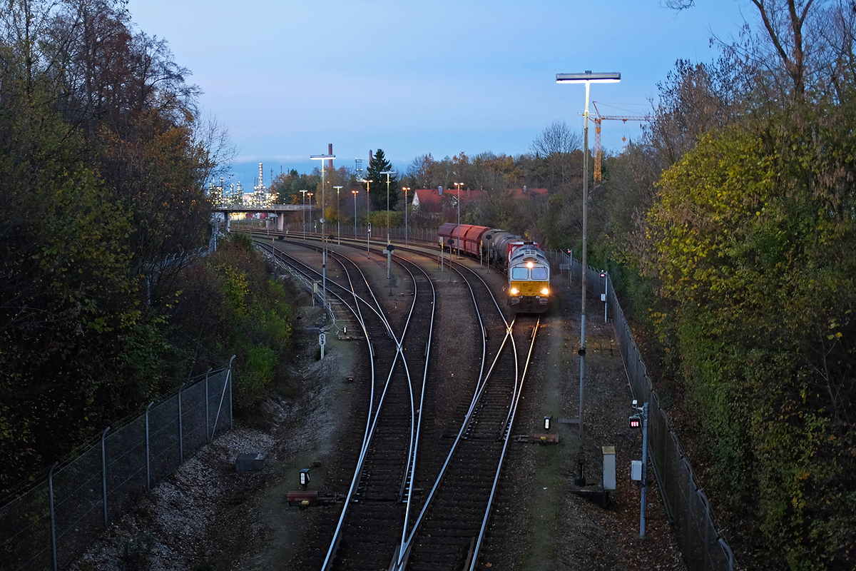 Blick auf die Richtungsgruppe des Rangierbahnhofs des Wacker Werks Burghausen. Das Gleis im Vordergrund ist das Verbindungsgleis zwischen der Einfahrgruppe des OMV-Werkbahnhofs (rechts außerhalb des Bildes) und der Raffinerie. 08.11.2013