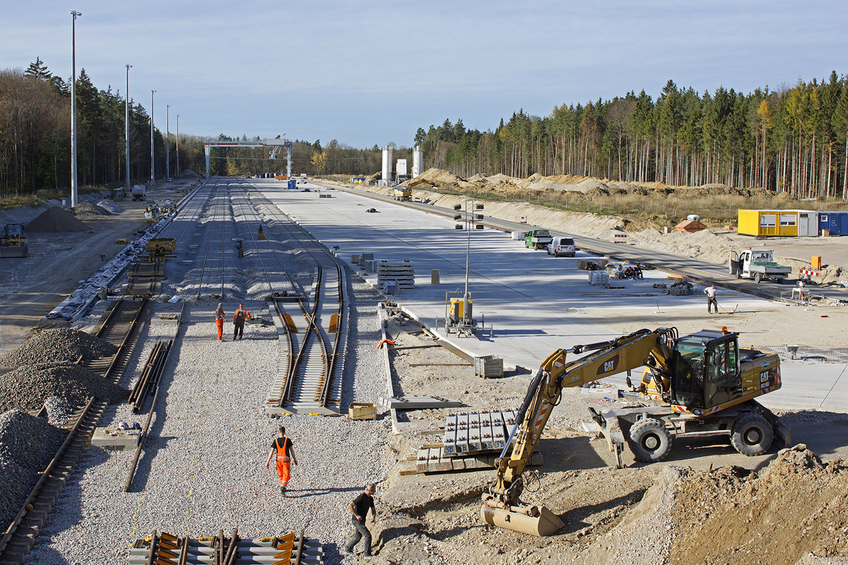 Die Bauarbeiten am neuen Containerterminal in Burghausen machen schnelle Fortschritte. Die Gleise werden von Hand verlegt. Die Ladegleise sind bereits eingeschottert. 08.11.2013