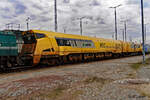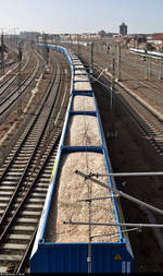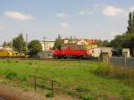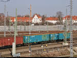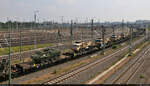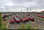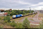 187 160-7 kommt mit 261 043-4 (Voith Gravita 10 BB) und etlichen verschiedenen Güterwagen im Schlepp aus dem Bereich der DB Cargo Werkstatt in der Zugbildungsanlage (ZBA) Halle (Saale) gefahren.